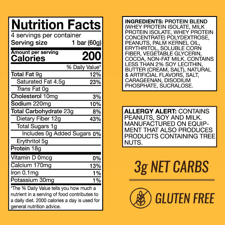 Protein blend (whey protein isolate, milk protein isolate, whey protein concentrate), polydextrose, peanuts, palm kernel oil, erythritol, soluble corn fiber, vegetable glycerin, cocoa, non-fat milk. Contains less than 2% soy lecithin, butter (cream, salt), natural & artificial flavors, salt, carrageenan, disodium phosphate.